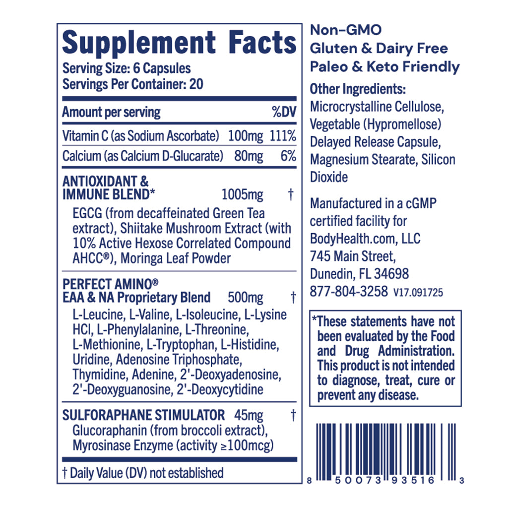 Each serving provides EGCG, AHCC®, Moringa, Glucoraphanin, and Myrosinase for sulforaphane activation — enhanced with PerfectAmino® for optimal cellular protein support.*