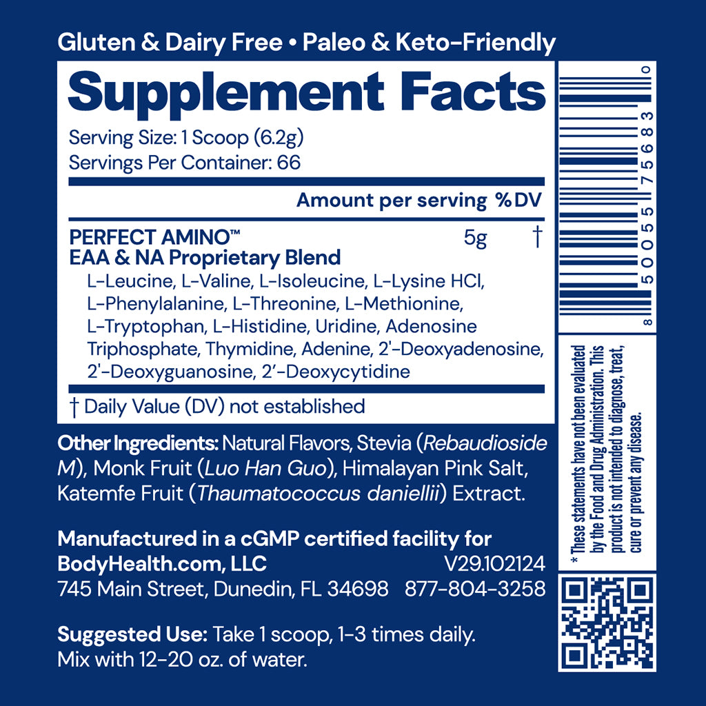PERFECT AMINO™ is 100% Vegan, free of Gluten, Soy, and Dairy, non-GMO.